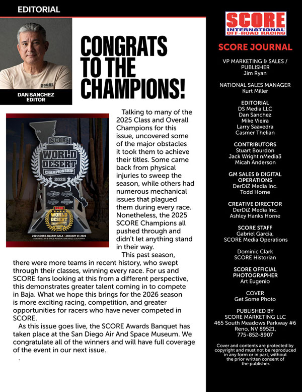 Para más información sobre SCORE, visita la página de internet oficial del Campeonato Mundial del Desierto de SCORE en www.SCORE-International.com.